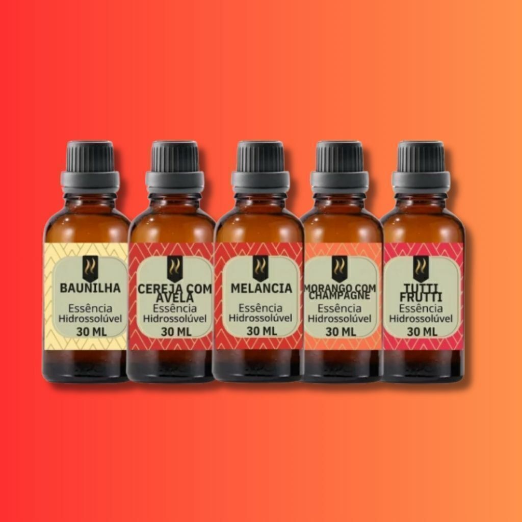 Essências Kit 5 Frascos, fragrâncias: Baunilha - Cereja com avelã - Melancia - Morango com champagne - Tutti fruti